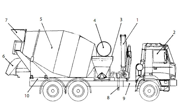 Na obr. 1 je znázornený autodomiešavač, respektíve automiešač s hydraulickým vykladacím zariadením, ktorý sa skladá z kabíny vodiča (2) a základného rámu (9). Na základnom ráme je uložený prídavný rám s nadstavbou miešača alebo domiešavača tvoreného prepravným bubnom (5). Prepravný bubon je v zadnej časti vybavený polohovateľnou výsypkou (6) a plniacou násypkou (7) bubna. V zadnej časti na základnom ráme (9) je rýchloupínacím mechanizmom upevnené hydraulické vykladacie zariadenie (1) vybavené hydraulickými podperami (8). V prednej časti za kabínou vodiča (2) je odnímateľne upevnený betonársky kôš (3). Na prídavnom ráme (10) nad pohonom prepravného bubna (5) je ešte upevnená nádrž na vodu (4).
