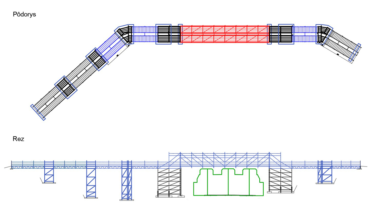 - Nosná konštrukcia: Je zhotovená z lešenia Ringlock doplneného o drevenú protišmykovú preglejku, ktorá tvorí pochôdznu plochu. Nosná konštrukcia je dlhá zhruba 80 m. Najdlhšie pole dočasného mosta má rozpätie 20,5 m a bolo navrhnuté ako priehradový väzník s výškou 3,1 m, vytvorený z bežných prvkov lešenia Ringlock. Výška podopretia je variabilná, od 3,2 až po 7,3 m.