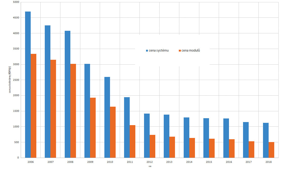 Obr. 1 Vývoj ceny fotovoltických systémov a samotných modulov v Nemecku pre elektrárne s výkonom 10 až 100 kWp