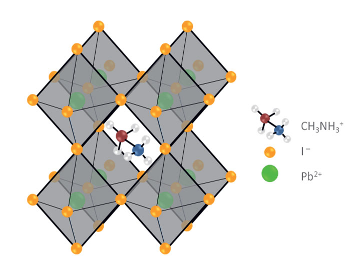 Obr. 2 Kryštalická štruktúra hybridného perovskitu v základnom zložení CH3NH3PbI3