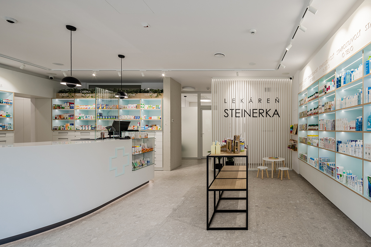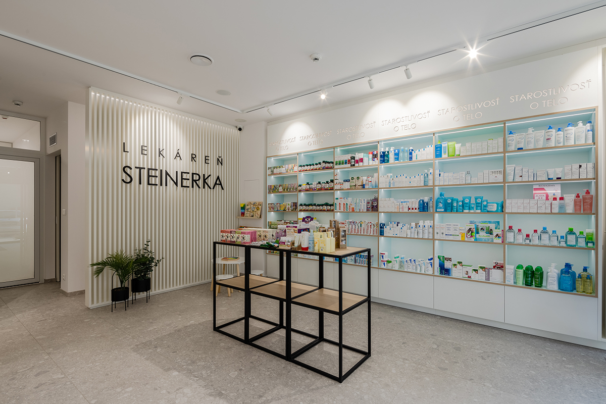 Lekáreň Steinerka na Bernolákovej ulici v Bratislave je sviežim dychom v architektonickom riešení komerčných priestorov. Interiér navrhli architekti Štefan Kačáni a Ján Kamenský z ateliéru Plus 2 architekti.