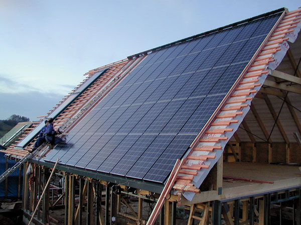 Ďalej treba vytvoriť náhradný spôsob odvetrávania na zachovanie maximálnej miery dosiahnuteľnej účinnosti za daných klimatických podmienok. V inštalácii na pasívnom dome v obci Koberovy (obr. 2b), kde sú na ploche 60 m2 nainštalované FV moduly s celkovým výkonom 8,5 kW, je toto odvetranie riešené vzduchovou dutinou medzi FV panelmi a strechou (obr. 3). Do tejto dutiny sa vzduch nasáva otvorom pod presahom strechy a vyúsťuje pri hrebeni strechy, kde je z ochranných dôvodov umiestnená mriežka. Konštrukcia a povrch FV panelov dokonale odoláva poveternostným podmienkam – dažďu, snehu a krupobitiu (krúpy do priemeru 2,5 cm). Ak sú FV panely takouto integrálnou súčasťou strešnej konštrukcie budovy, možno ich navrhovať iba ako vonkajší plášť dvojplášťových konštrukcií s nalisovanou otvorenou vzduchovou medzerou (obr. 2b). Všetky ďalšie elektroinštalačné prvky systému, ako sú DC/AC striedače a rozvádzače (prípadne akumulátory), zaberajú minimum priestoru a môžu byť umiestnené v ľubovoľnom odvetranom priestore budovy.