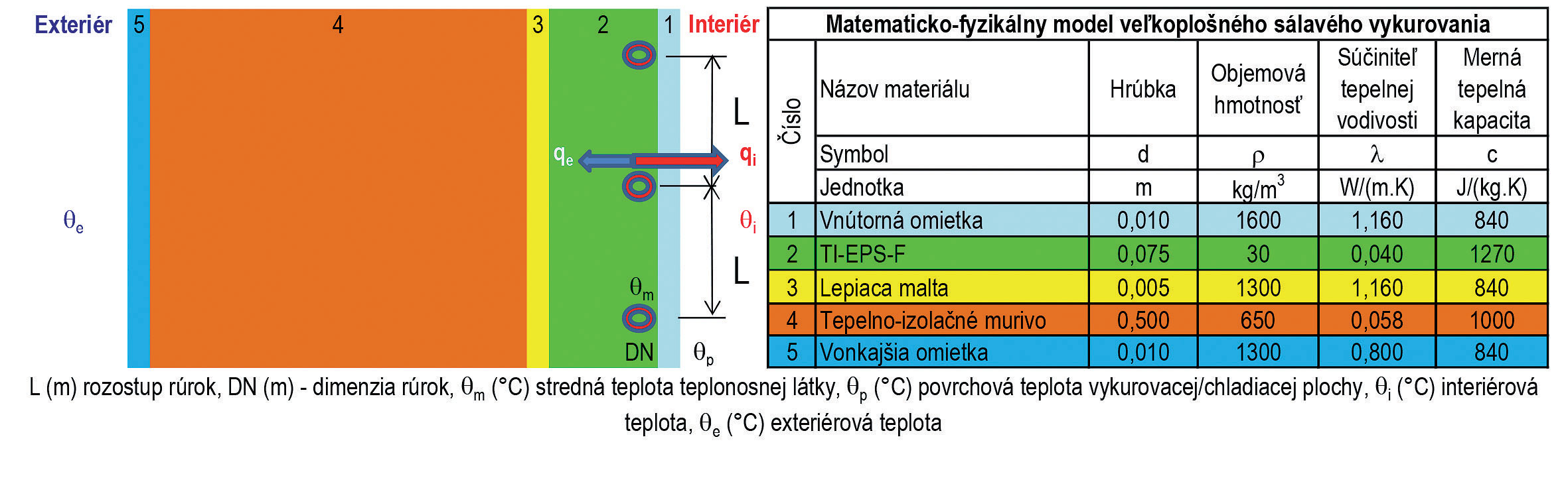 Obr. 1 Matematicko-fyzikálny model podomietkového veľkoplošného vykurovania na obvodovej stene a jednotlivé materiálové charakteristiky podľa STN 73 0540 – 3 (Zdroj: autor – Kalús, D.)
