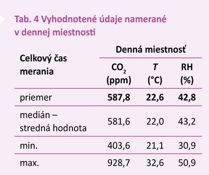 Tab. 4 Vyhodnotené údaje namerané v dennej miestnosti