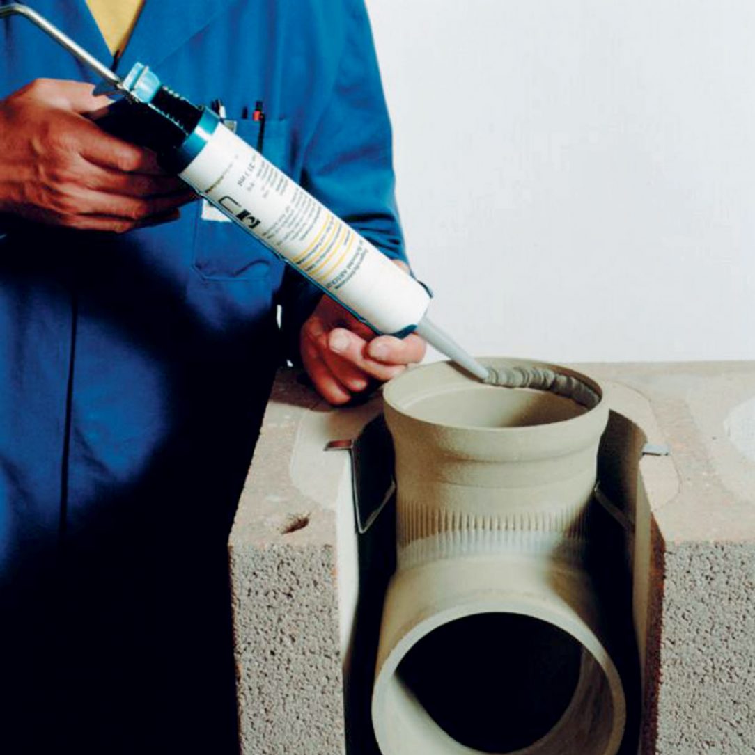 Do hrdla vložky sa nanesie v dostatočnom množstve škárovací tmel. Po obvode tvárnice aj do priestoru medzi izoláciou a otvorom na statické zabezpečenie komína sa nanesie tenkovrstvová malta. Do malty sa osadí tvárnica s vyrezaným otvorom pre napájací kus dymovodu. Na výrez sa použije priložená šablóna.