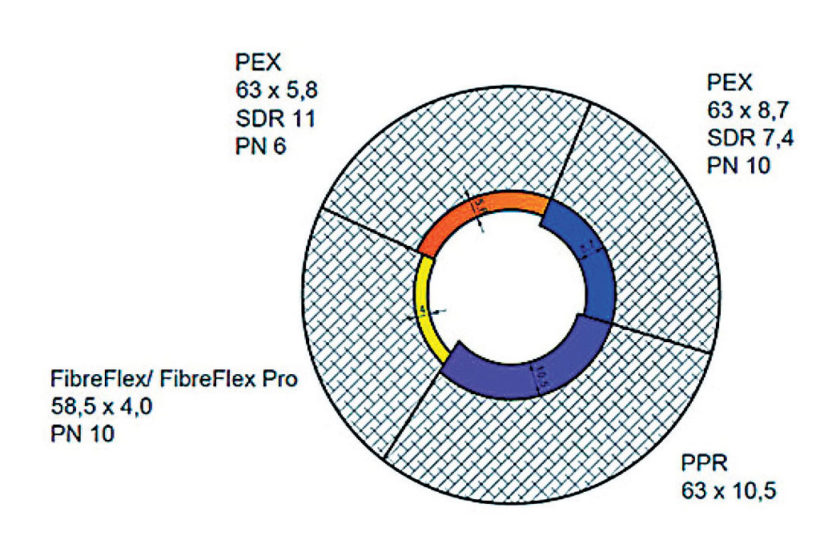 Vďaka tomu, že pri flexibilných plastových potrubiach NRG FibreFlex je menšia hrúbka steny rúrky, možno v porovnaní s pôvodným návrhom tyčí PPR znížiť pri použití tohto potrubia svetlosť o jednu dimenziu. Tým sa zachovajú vnútorný prierez a prietok v potrubiach a zároveň sa nezmenia tlakové pomery podľa výpočtu a zaregulovania siete.