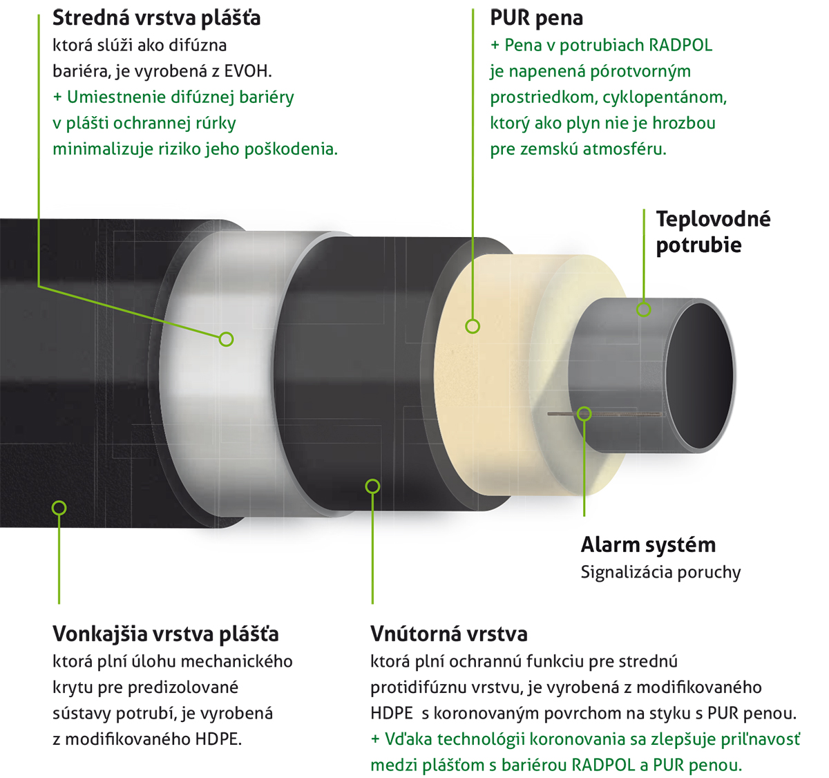 Pri predizolovaných potrubiach s difúznou bariérou majú potrubia pridanú strednú vrstvu z EVOH, ktorá je zabudovaná priamo v plášti HDPE.