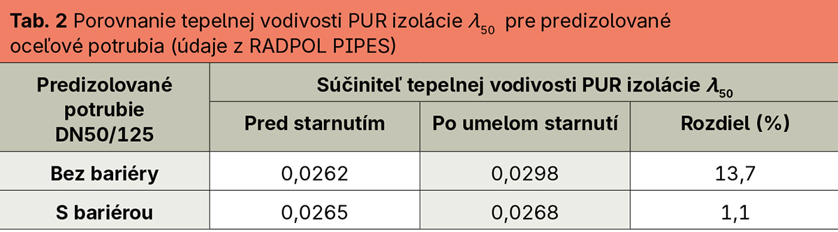 Pozitívny efekt difúznej bariéry bol potvrdený meraniami súčiniteľov tepelnej vodivosti PUR izolácie λ₅₀. Podľa literárnych zdrojov počas umelého starnutia štandardného potrubia DN50/125 sa tento súčiniteľ pri systémoch bez bariéry zvýšil v rozsahu od 4,3 do 14,4 % [3, 8], zatiaľ čo pri systémoch s difúznou bariérou iba v rozsahu od 0,36 do 4,23 % [4]. Hodnoty súčiniteľa λ₅₀ predizolovaných potrubí RADPOL PIPES sa tiež nachádzajú v uvedených medziach (tab. 2).