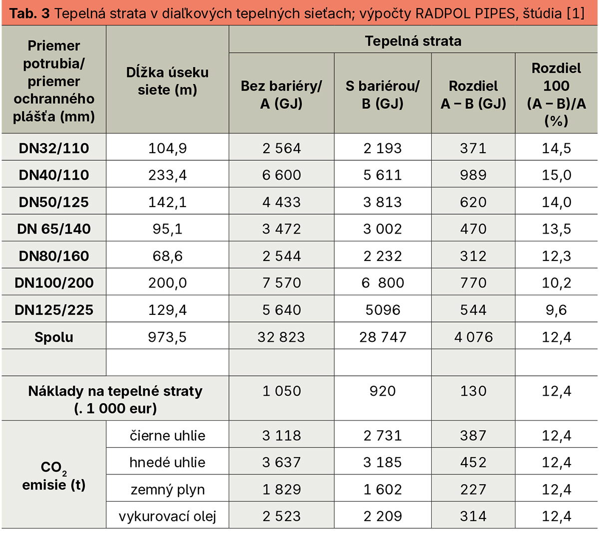 Výpočty boli vykonané pre dva varianty – pre predizolované oceľové potrubia bez difúznej bariéry a s touto bariérou. V druhom variante sa predpokladalo, že bariéra sa nachádza nielen v priamych potrubiach, ale aj vo všetkých tvarovkách a v spojoch. Tepelné straty boli určené pre jeden rok, s predpokladom zmien hodnôt súčiniteľa λ₅₀ podľa Tabuľky 4 z [10].