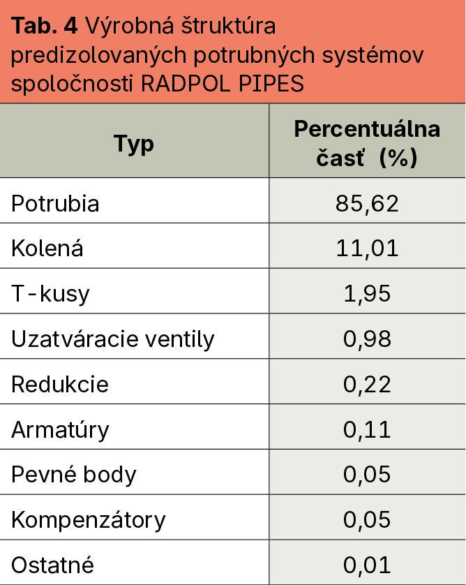 Príklad výrobnej štruktúry predizolovaných systémov spoločnosti RADPOL PIPES je uvedený v tab. 4. Ako vidieť, iné výrobky než priame potrubia majú v priemere až 15-percentný podiel na dĺžke siete, preto je dôležité aplikovať difúznu bariéru aj na tieto komponenty [1].