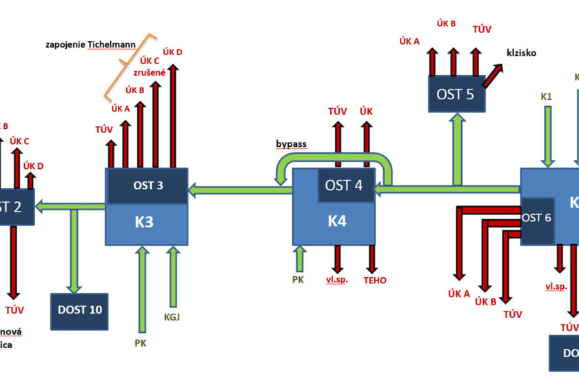 Teplo do systému ÚK a na ohrev TV sa pripravuje v tlakovo nezávislých OST 2, OST 3, OST 4, OST 5, OST 6 a 9 DOST. V tepelnom hospodárstve sa prioritne využíva drevná štiepka zo zdroja K-6, z ktorého sa teplo dodáva do primárneho rozvodu. V prípade výpadku K-6 alebo špičkových odberov v zimných mesiacoch možno do primárneho rozvodu dodávať teplo z K-3 a K-4.