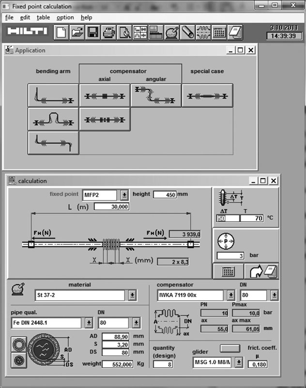 - výpočet síl do pevných bodov musí zohľadňovať práve aj zložku od „nafúknutia“ kompenzátora vplyvom pretlaku (sila na pevný bod od pretlaku potrubí je FP = pmax . A0 , kde A0 je aktívna plocha kompenzátora udávaná výrobcom; zreteľne vidieť, že čím je vyšší pretlak v potrubí, tým väčšia je sila na pevný bod; na obr. 4 možno vidieť výpočet síl do pevných bodov pomocou softvéru),