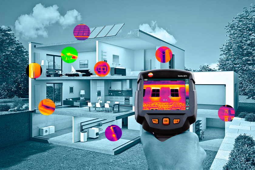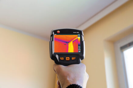 Termokamery Testo rýchlo a spoľahlivo odhalia odchýlky a poruchy na plášťoch budov aj vo vnútorných priestoroch. Materiály a konštrukčné časti stavieb sa pomocou zobrazovacej metódy kontrolujú úplne nedestruktívne. Bezdotykovo je možné určiť miesta energetických strát, tepelné mosty a úniky tepla. Zatiaľ čo pri iných metódach je potrebné systémy vedení a potrubí na veľkej ploche rozoberať, s termokamerou Testo postačí jediný pohľad. V termografii budov je jedinečné zobrazenie povrchovej vlhkosti určené na rýchlu lokalizáciu miest s rizikom výskytu plesní.