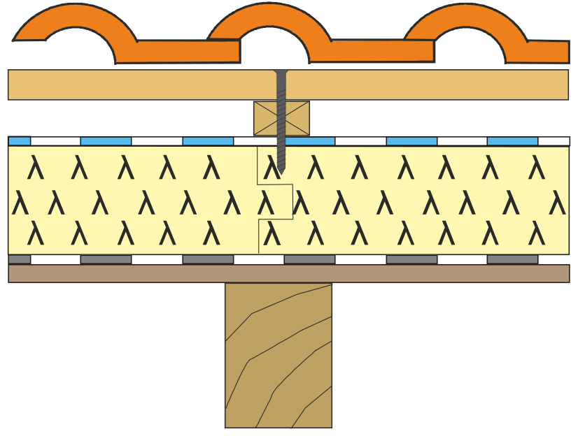 Obr. 5 Perforácia hydroizolácie a tepelnoizolačnej dosky PIR skrutkou pri nadkrokvovom zateplení strechy