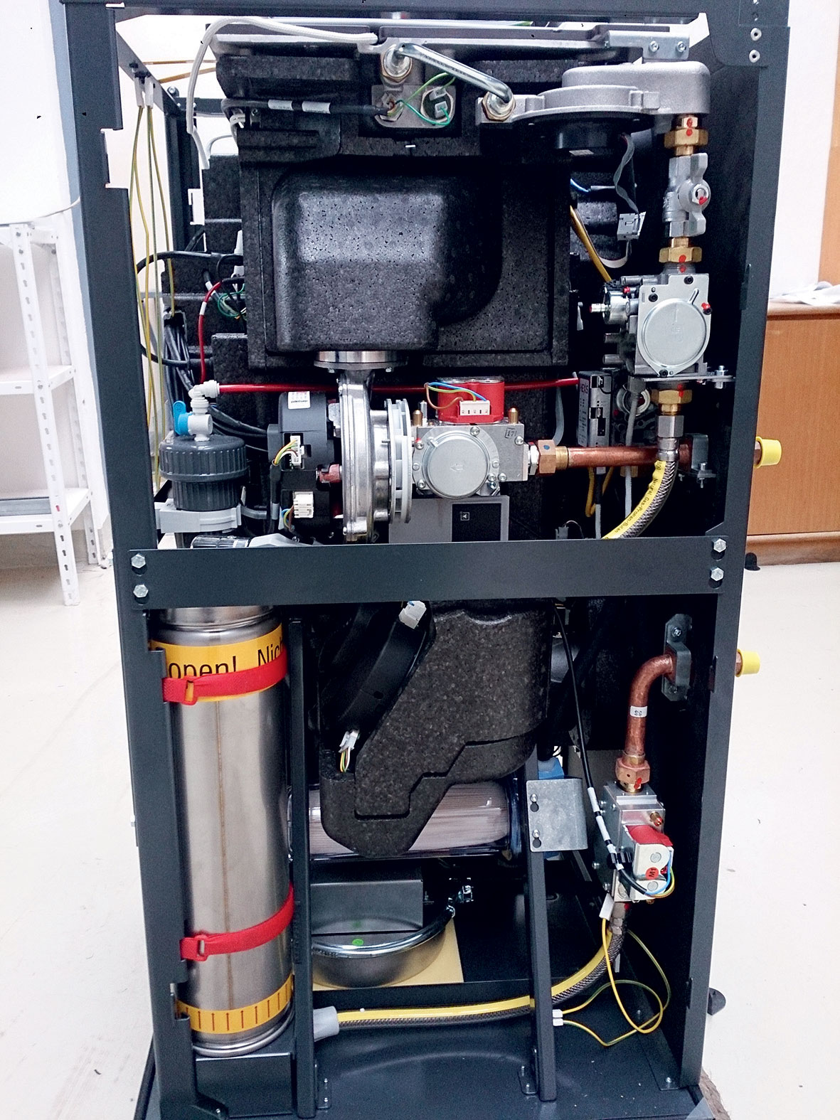 Obr. 1 Mikrokogeneračná jednotka s palivovými článkami b) pohľad na integrovaný kondenzačný kotol – spodná časť jednotky