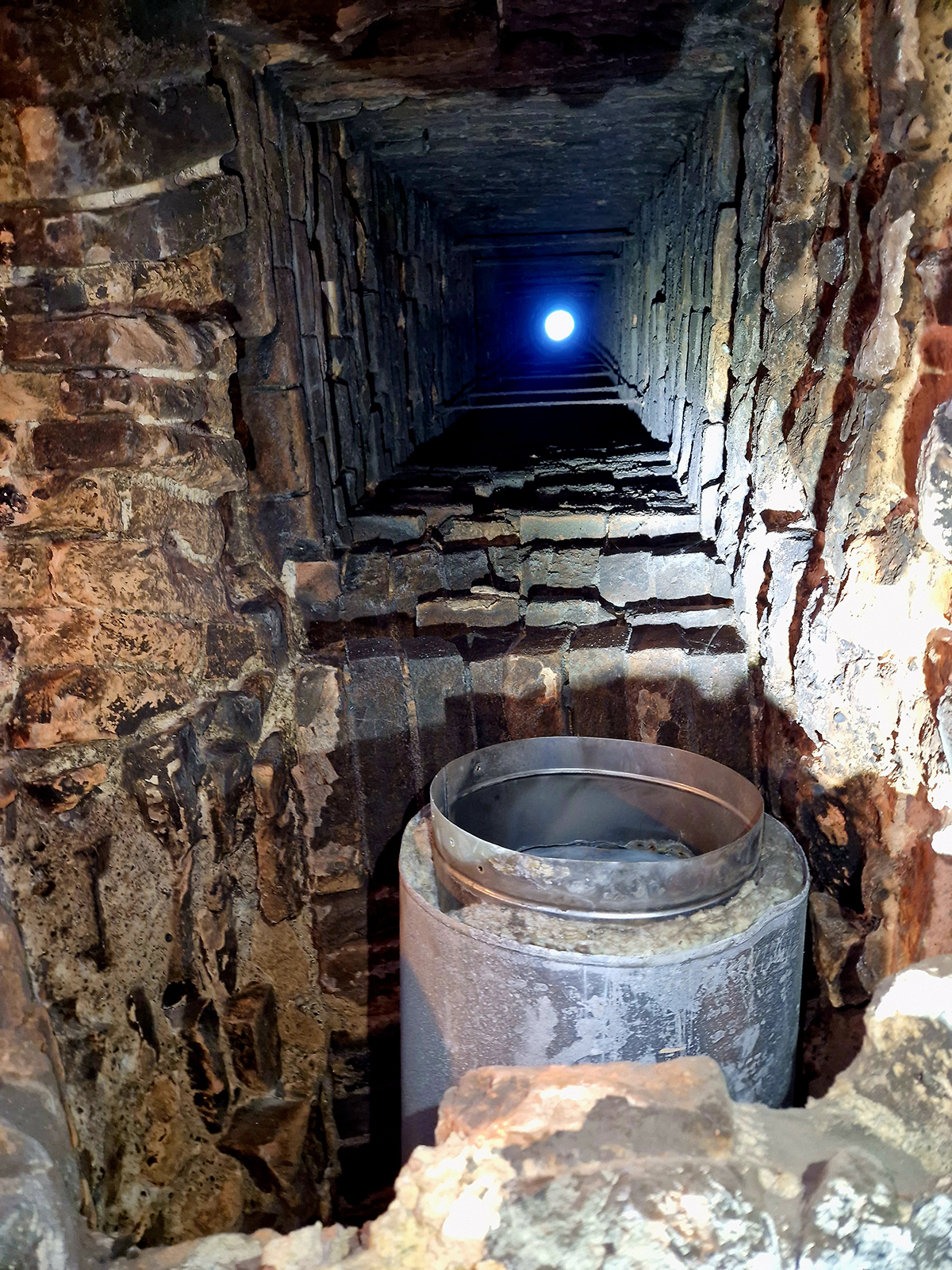 Prvou a náročnou úlohou bolo celkové preskúmanie kotolne umiestnenej pod skleníkom a zistenie skutočného stavu celého spalinového potrubia. Dymovod sa nachádzal za stenou, preto nebolo jasné, aký má profil, smer a dĺžku. Prvý návrh bol založený iba na predpokladoch a skúsenostiach našich pracovníkov. Až pri samotnej realizácii a vybúraní steny sme zistili, že ide o šachtu vymurovanú tehlami, profilovanú s rozmermi 60 × 60 cm.