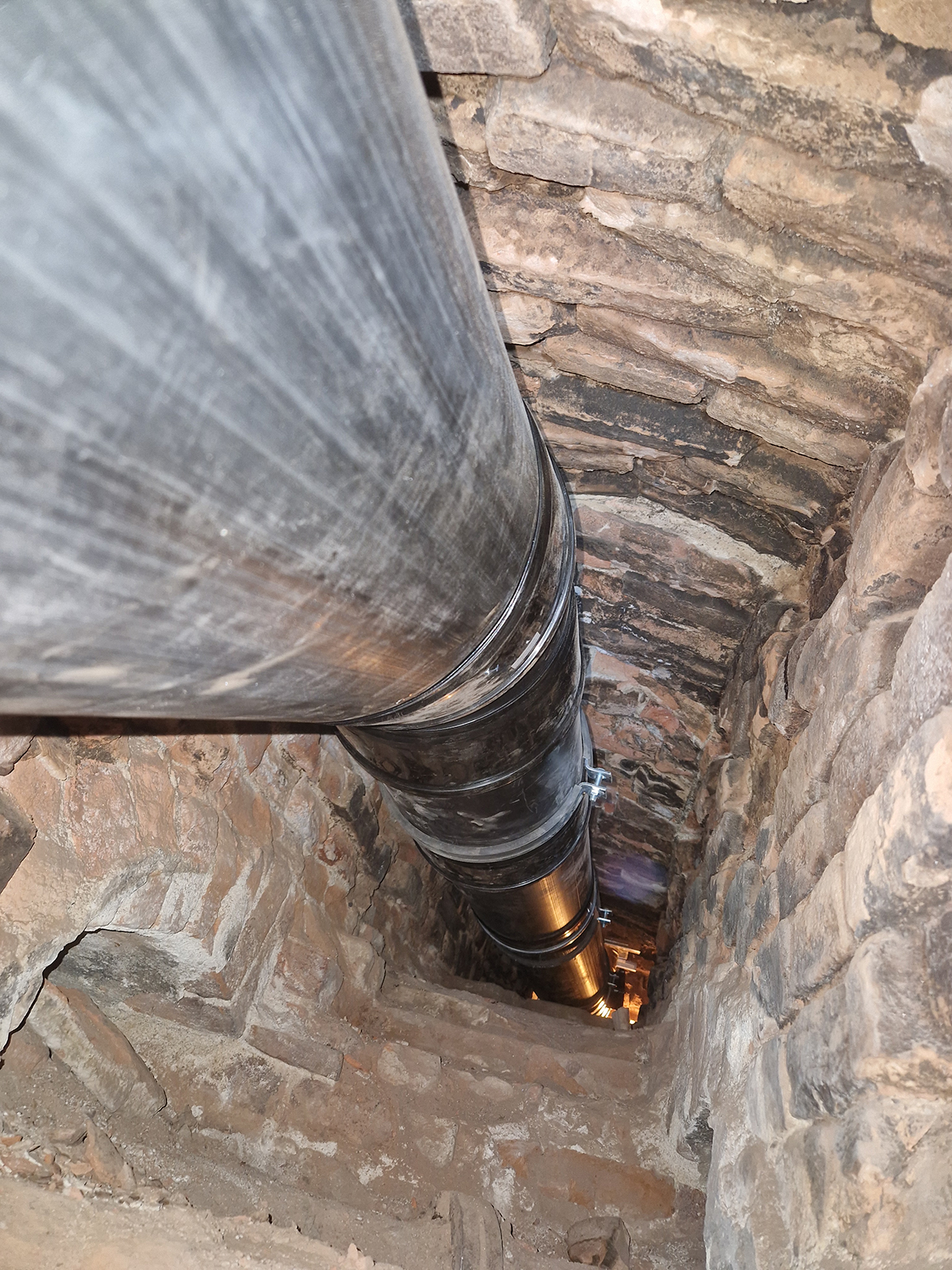 To kladie veľký dôraz na dokonalú tesnosť celého komínového potrubia (vlhkosť a pretlak) a najmä na jeho horizontálnu časť (medzi hrdlom kotla a komínovým pripájaním). Preto bola v horizontálnej časti použitá plastová sústava ALMEVA STARR s vonkajším priemerom 315 mm a následne vo vertikálnej časti sústava z nehrdzavejúcej ocele ALMEVA EW s priemerom 300 mm (napojená „po vode“).