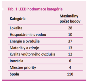 Samostatne sa hodnotia lokalita stavby, výber stavebných materiálov, energetická náročnosť, úspora vody, vplyv na ovzdušie, inovácie a kvalita vnútorného prostredia. Jednotlivé kategórie sú hodnotené maximálnym počtom bodov v takom poradí, aby zohľadnili dôležitosť každej kategórie v rámci celého systému (tab. 1).