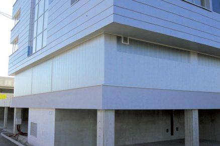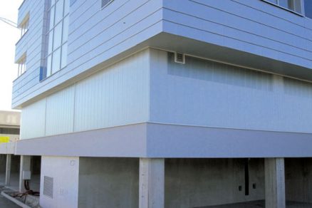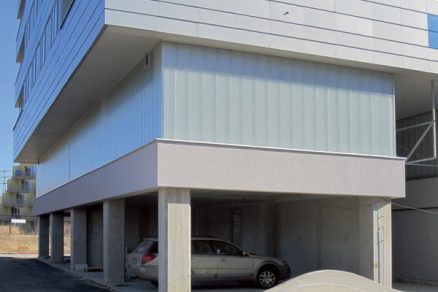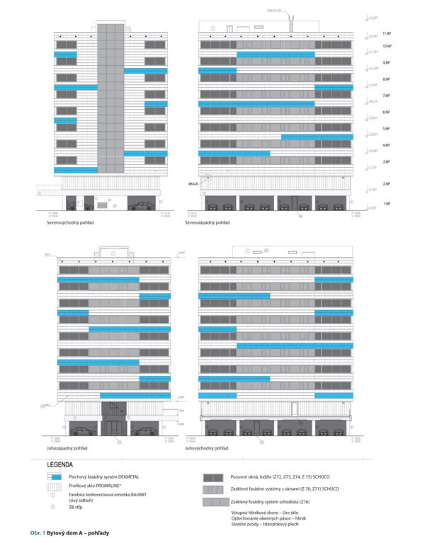 Architektonické riešenie fasády bytových častí objektu je z hľadiska členenia a použitých materiálov navrhnuté ako kombinácia častí sklených pásov, zasklených rohových terás (lodžií) a parapetných pásov z metalického kazetového obkladu (obr. 2). Zadnú (severovýchodnú) fasádu na celú výšku objektu tvorí priebežná schodisková sklenená stena (obr. 3) kombinovaná s metalickým obkladom. Na obloženie spodného podlažia obytných častí po celom jeho obvode (podlažie s technickým zázemím) sa použili sklenené diely z profilového skla (obr. 4 a 5).
