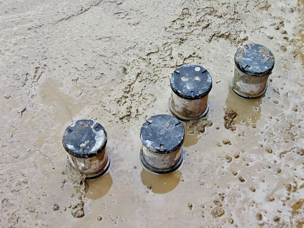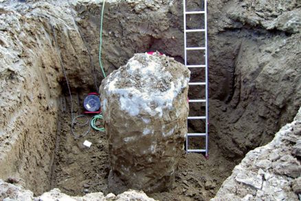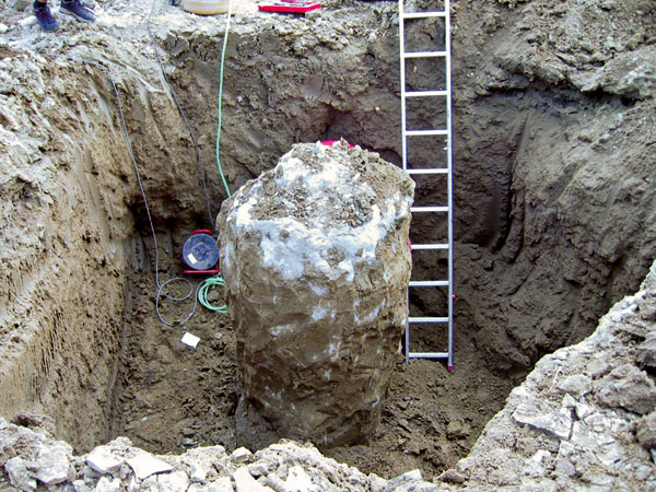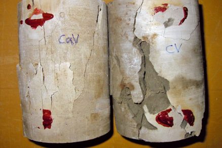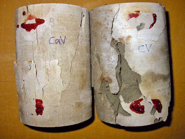 Piliere PI sa zhotovili modifikovanou metódou M1 tak, aby sa aj v ílovitých zeminách dosiahol priemer 0,9 m. Na zistenie materiálových vlastností pilierov PI sa už úplne bežne využíva odber vzoriek premiešanej prebytočnej zmesi z výronu z ústia vrtu (obr. 3). Po ich vyzretí v mokrom prostredí sa vykonali laboratórne skúšky na stanovenie pevnosti a deformačných modulov. Zhotoviteľ pilierov PI na preukázanie skutočne dosiahnutého priemeru a účinnosti zvolenej technológie v ílovitých zeminách vsadil navyše dva krátke pokusné piliere PI do hĺbky 4 m a následne ich vykopal (obr. 4). Z týchto pilierov sa jadrovými vrtmi odobrali vzorky na stanovenie materiálových vlastností laboratórnymi skúškami (obr. 6).