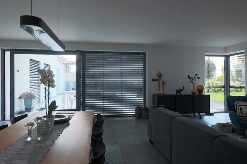 Aj pri spustených žalúziách môžete vďaka naklápacím lamelám veľmi presne kontrolovať intenzitu denného svetla – od mierneho tienenia až po takmer úplné zatemnenie.