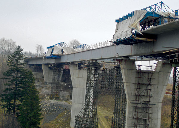 Vysúvanie a montáž oceľobetónovej konštrukcie mosta pri obci Skalité