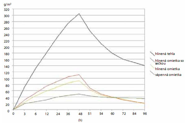 Absorpčná krivka na obr. 1 znázorňuje správanie hlinenej omietky, hlinenej tehly a vápennej omietky. Test sa realizoval v klimatizačnej komore pri teplote 21 °C. Pomocou roztokov nasýtených solí sa zvyšovala vlhkosť vzduchu zo 47 % na 76 % a po 48 hodinách došlo k jej opätovnému zníženiu na 47 % počas 48 hodín. Testovali sa materiály s hrúbkou 1,5 cm.