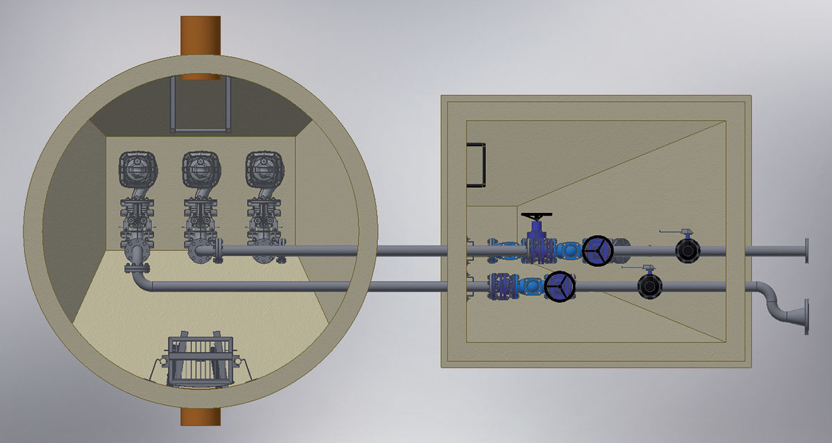 Tu sa budú splaškové vody zhromažďovať a po dosiahnutí určenej hladiny pri potrebnom objeme budú prečerpané splaškovými čerpadlami výtlačným potrubím (splaškovým) do nasledovnej ČS (princíp kaskády) až po vyústenie do gravitačného potrubia vedeného do ČOV (gravitačne).