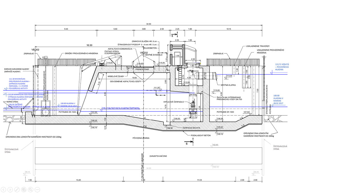 Obr. 2 Priečny rez zátvorným objektom s vyznačením prevádzkových a povodňových hladín