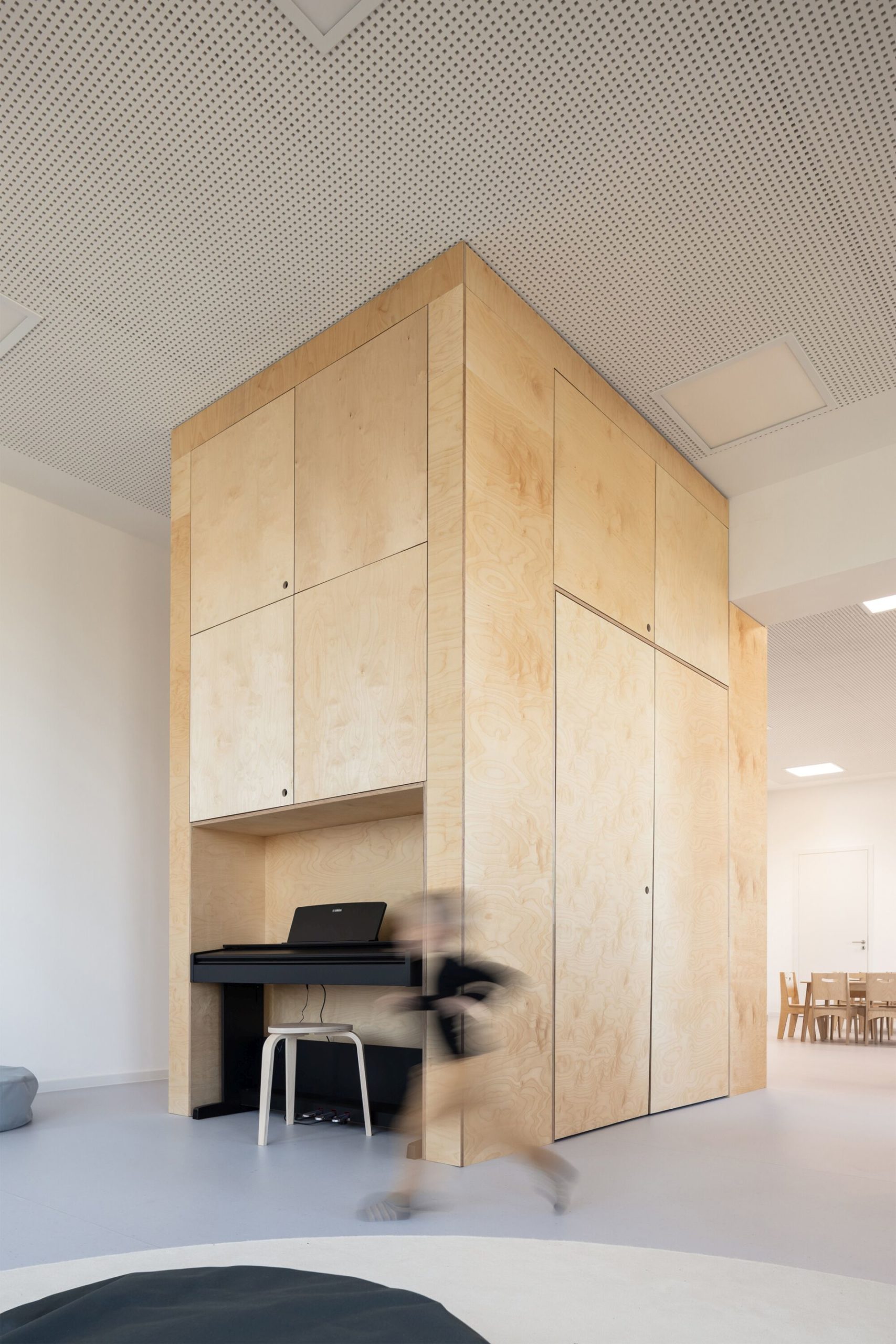 Pri odpočinku detí sa detské postieľky vytiahnu z vysokej skrine.