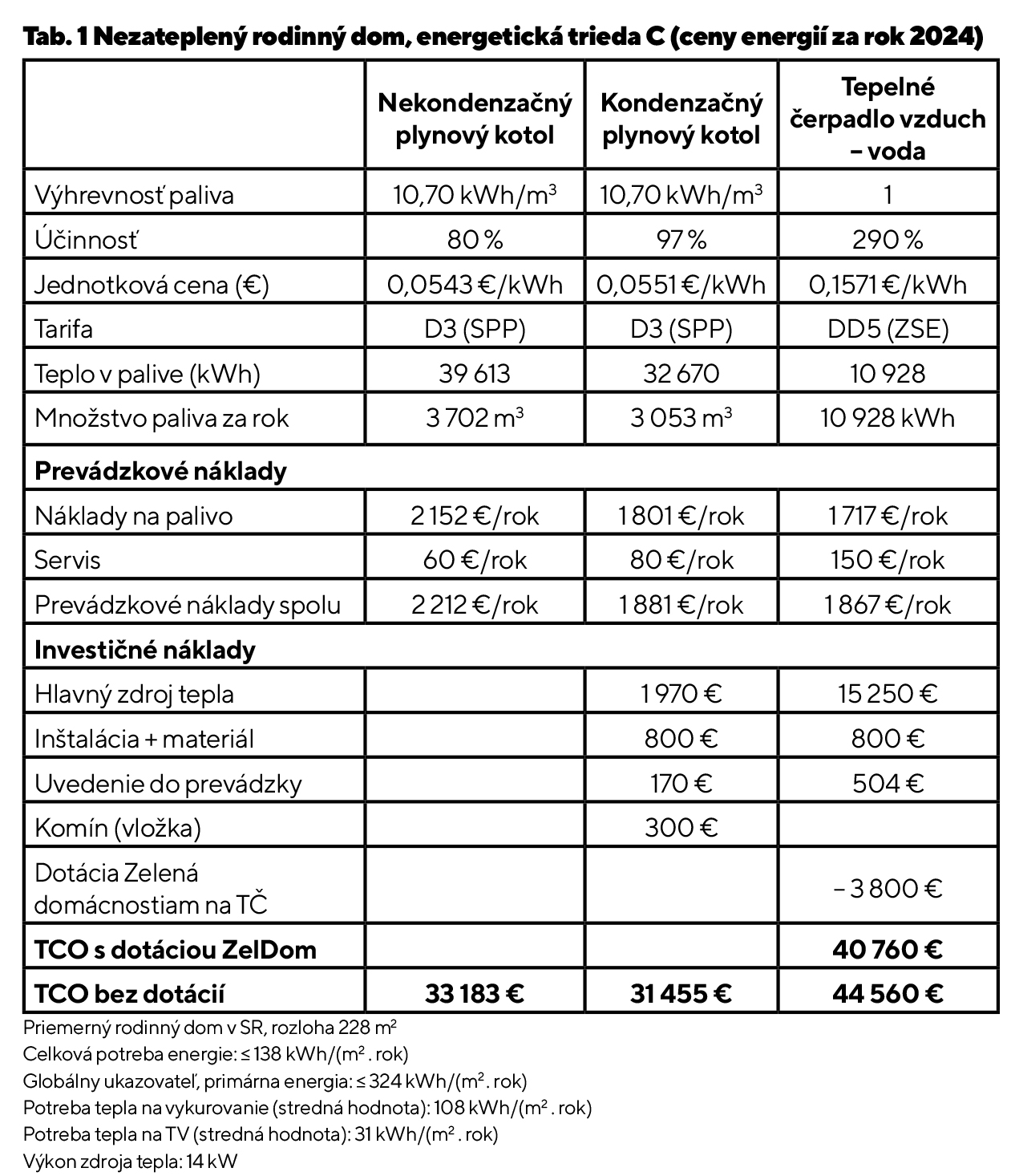 o 42 % až 45 % vyššie v porovnaní s plynovým kondenzačným kotlom (bez dotácie na tepelné čerpadlo z programu Zelená domácnostiam). Tento rozdiel nebude zásadným spôsobom ovplyvnený ani zavedením plánovaného rozšírenia systému obchodovania so skleníkovými plynmi pre sektor budov od roku 2027, resp. 2028, ktorý môže v prípade zemného plynu spôsobiť zvýšenie TCO len o 6 až 7 %. Navyše, cena nového nízkoemisného plynového kondenzačného kotla je veľmi priaznivá, pohybuje sa okolo 3 200 € vrátane inštalácie. Naopak, cena tepelného čerpadla typu vzduch – voda s inštaláciou dosahuje približne 12 600 €.